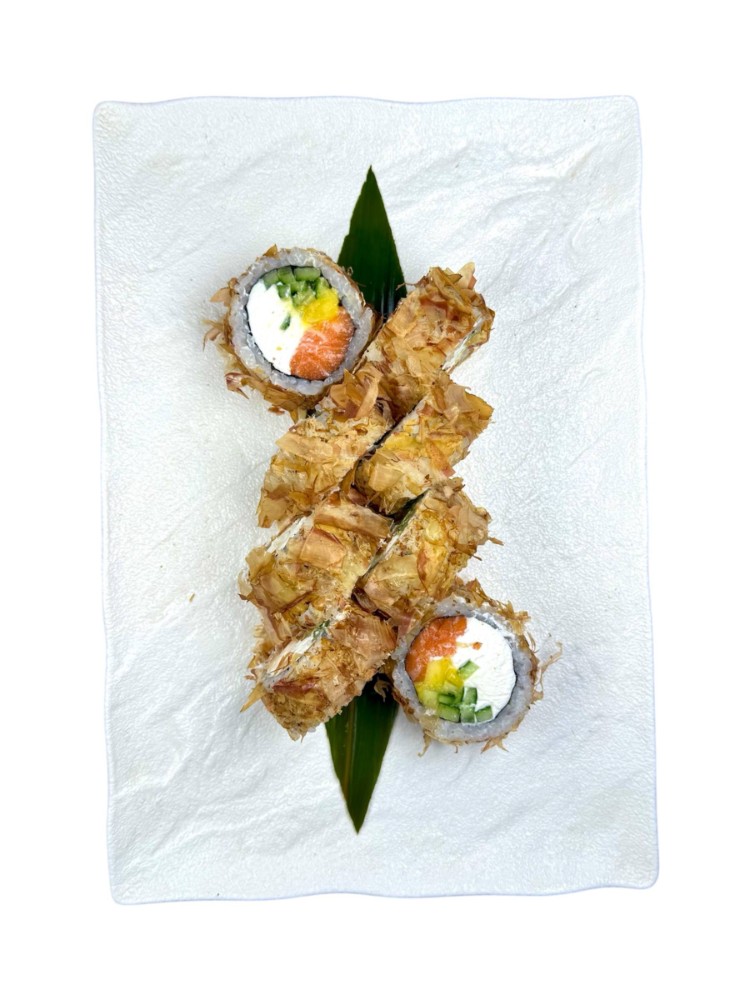 Рис, норі, смажений лосось, сурімі, огірок, крем сир, кляр, сухарі панко, соус нікамі, соус унагі, дегідрована цибуля