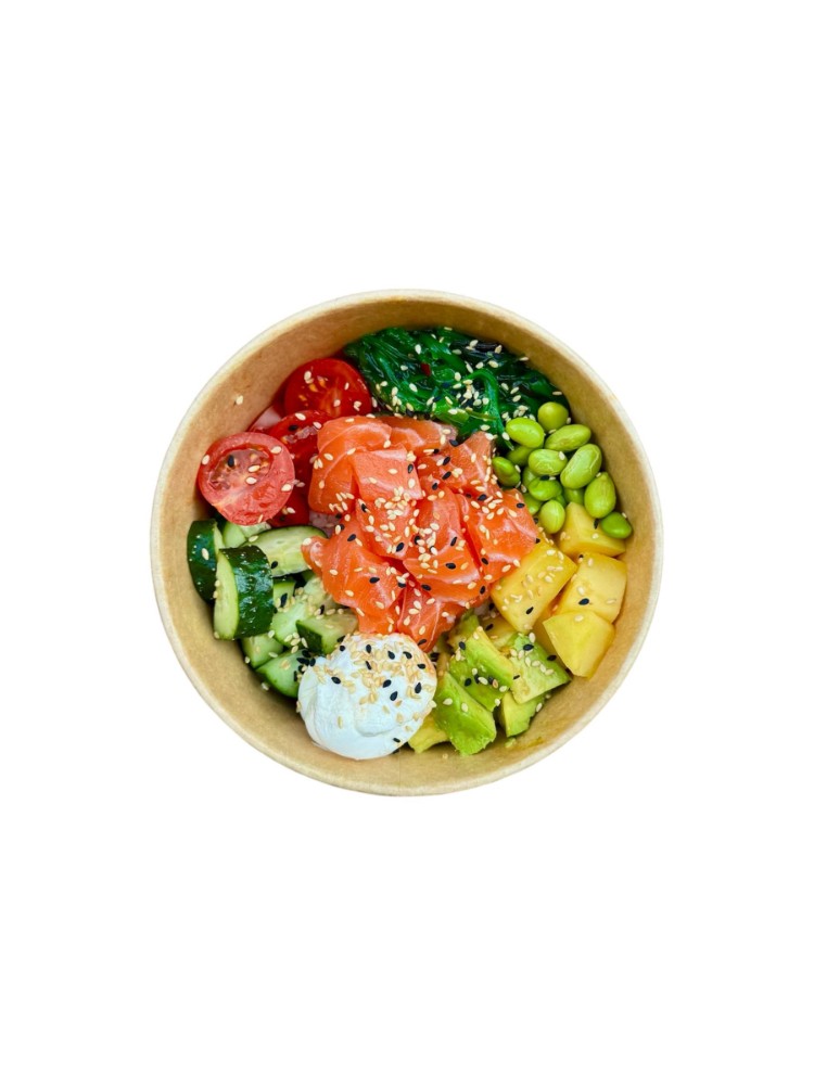 Рис, лосось, авокадо, манго, боби адамаме, салат чука, огірок, помідор чері, крем сир, кунжут, соус манго-чилі, соус такумі.
