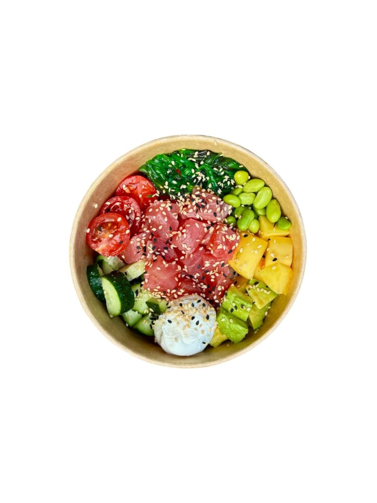 Рис, тунець, авокадо, манго, боби адамаме, салат чука, огірок, помідор чері, крем сир, кунжут, соус манго-чилі, соус такумі.