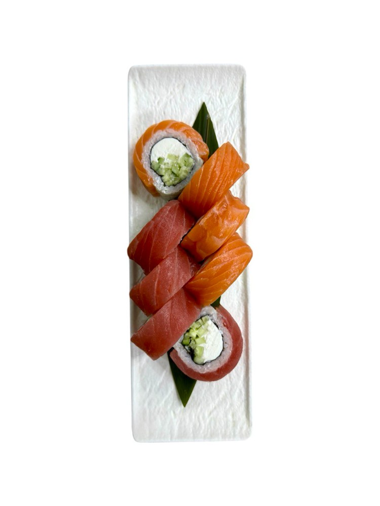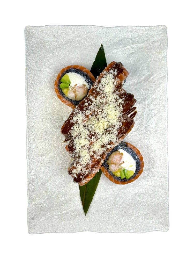 Рис, Норі, Крем сир, Лосось, Тунець, Огірок, Авокадо, Соус Унагі, Сир Пармезан