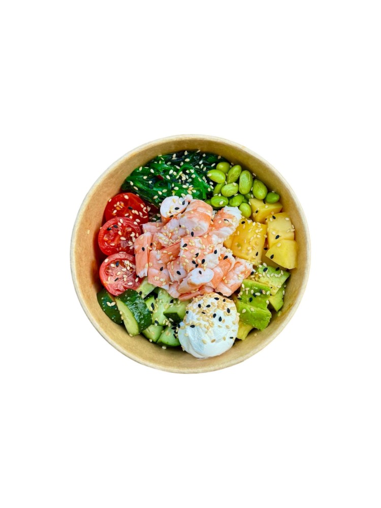 Рис, креветка, авокадо, манго, боби адамаме, салат чука, огірок, помідор чері, крем сир, кунжут, соус манго-чилі, соус такумі.