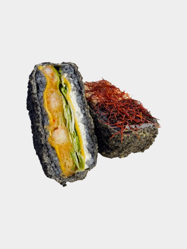 Рис, норі, чорнила каракатиці, лосось, авокадо, манго, креветка темпура, соус такумі, пармезан.