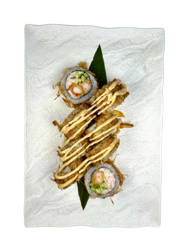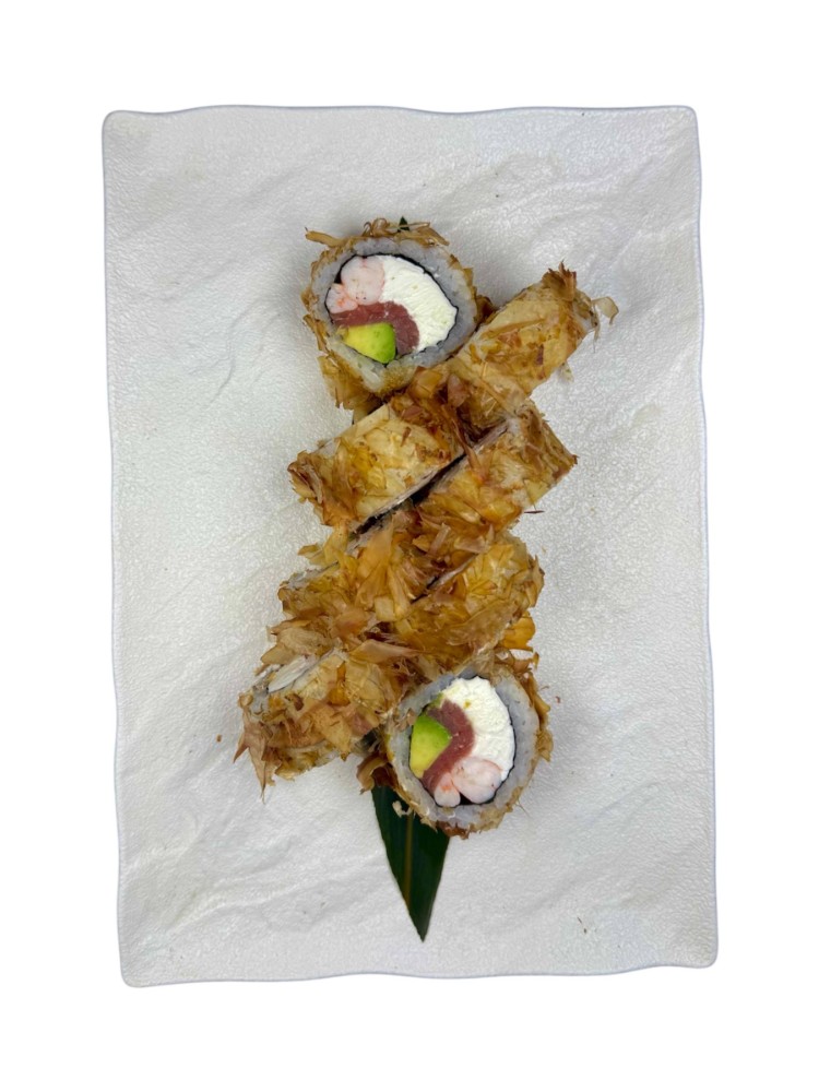 Рис, норі, крабовий мікс, огірок, креветка темпура, стружка тунця, соус нікамі.