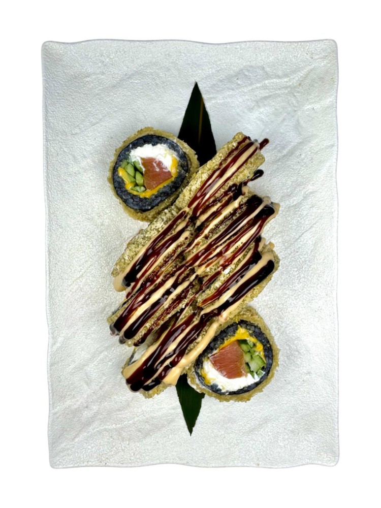 Рис, норі, тунець, манго, авокадо, груша, соус кисло-солодкий, соус унагі, кляр, сухарі панко