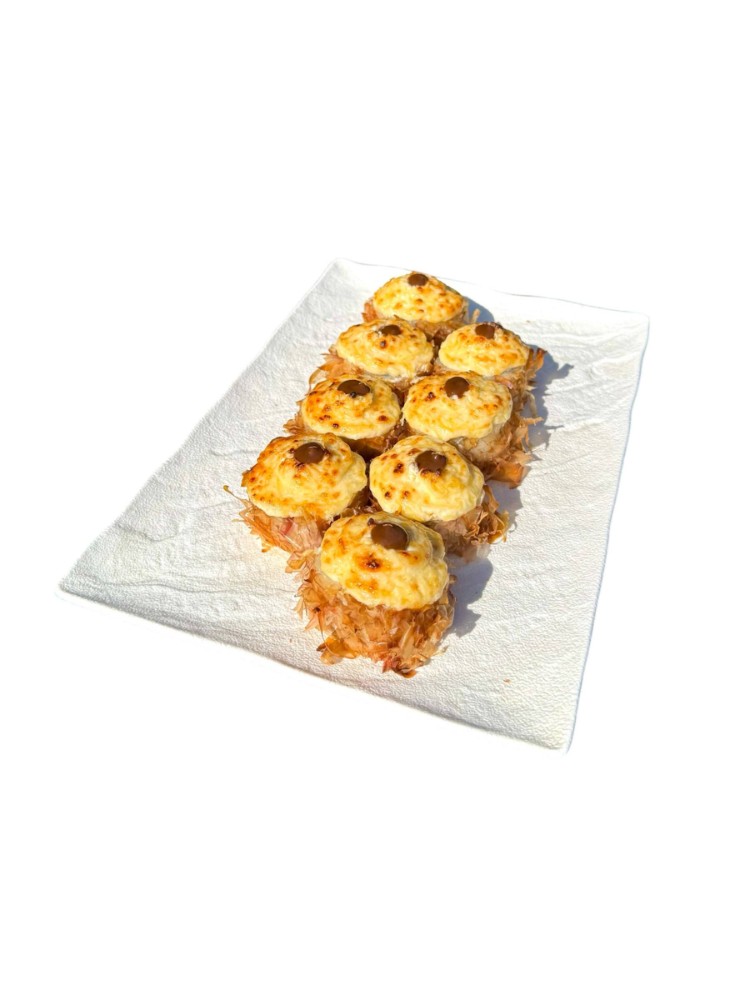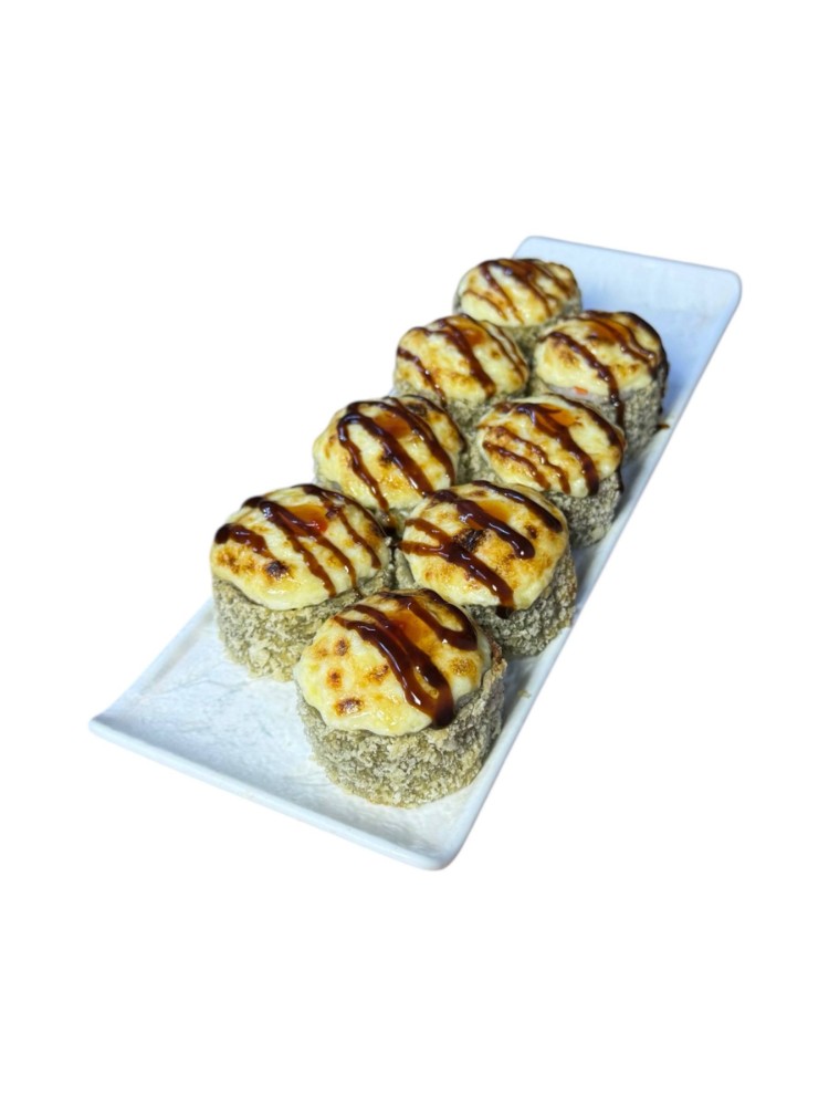 Рис, норі, тунець, крем сир, тамагоякі, авокадо, сирна шапочка, соус такумі, стружка тунця.